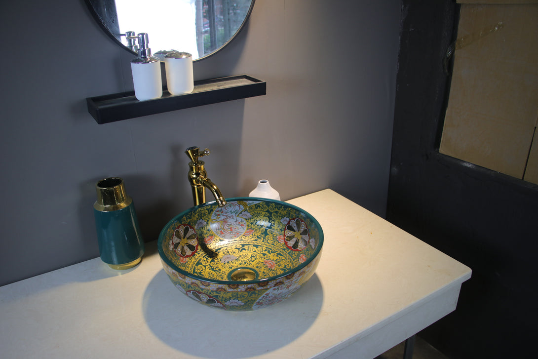 Elysia features a captivating fusion of vibrant greens and rich gold tones, adorned with intricate floral patterns that evoke a sense of vintage elegance. The round shape enhances its classic design, while the ornate detailing adds a touch of luxury. Perfect for elevating any bathroom space with an artisan, heritage-inspired aesthetic.