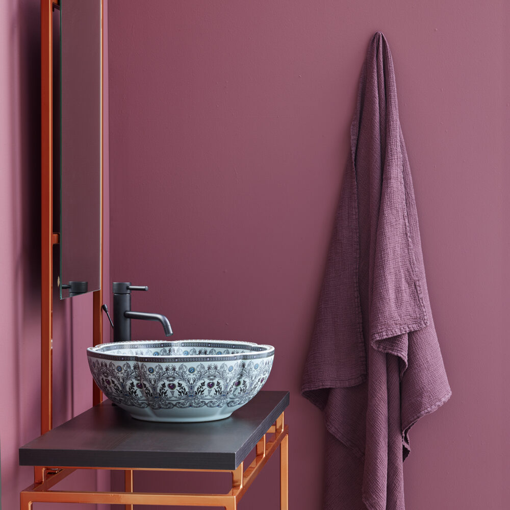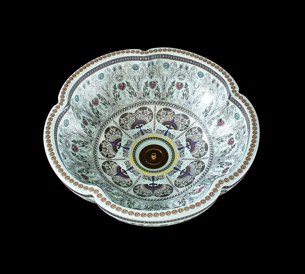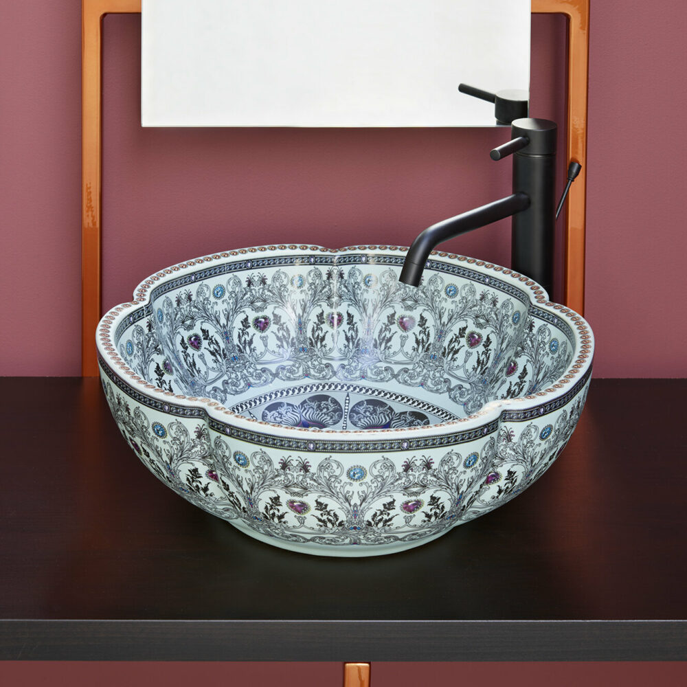 The Gabrielle countertop basin offers a contemporary reinterpretation of traditional Moorish designs, featuring a soft pale blue hue with a refined satin finish. Its elegant floral shape is enhanced by a stunning gemstone motif in amethyst purple and blue topaz, adding a touch of sophistication and charm. This modern yet classic design makes the Sophia basin a versatile addition to any bathroom, blending intricate artistry with sleek, modern aesthetics.