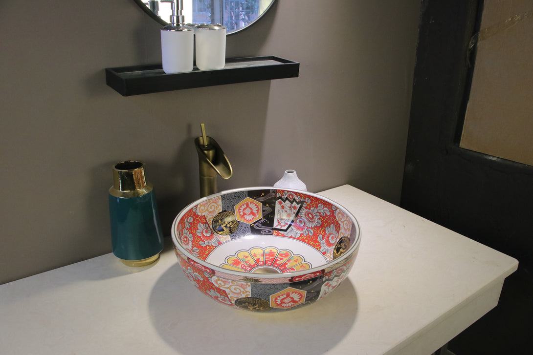 The Harmony countertop basin is a captivating fusion of traditional Asian motifs and contemporary design. Its vibrant, multi-colored pattern contrasts beautifully against a crisp white background, accented with subtle gold highlights. Featuring an intricate scroll design layered over a striking plant motif, this basin resembles a stunning work of art. The Harmony basin effortlessly brings a touch of outdoor beauty into your bathroom, infusing it with elegance and artistic flair.