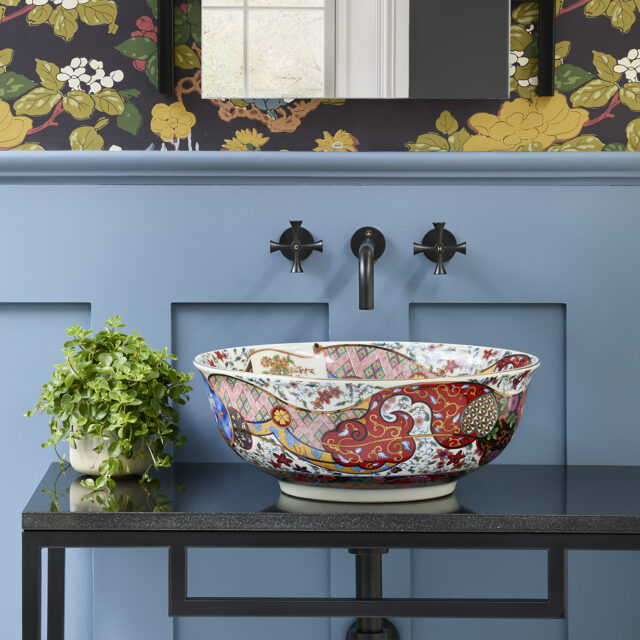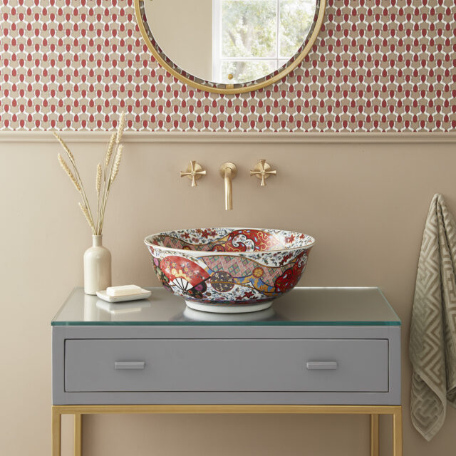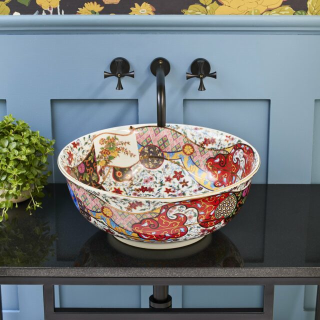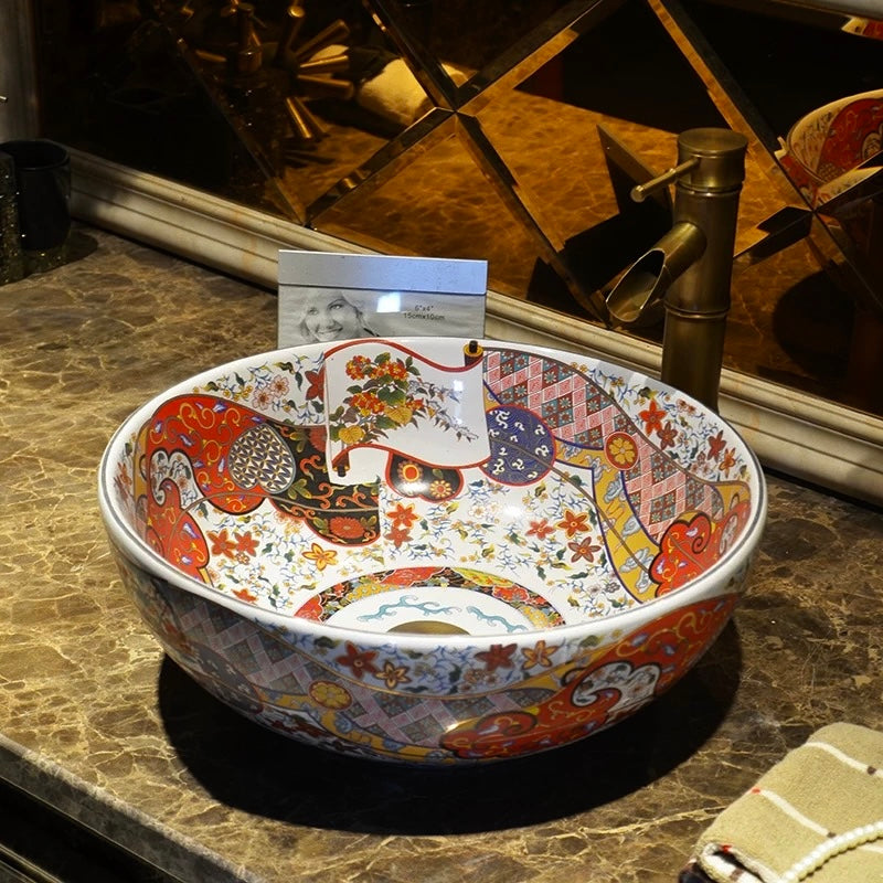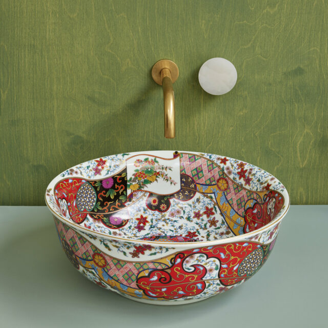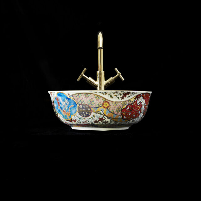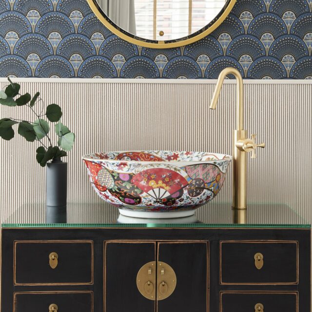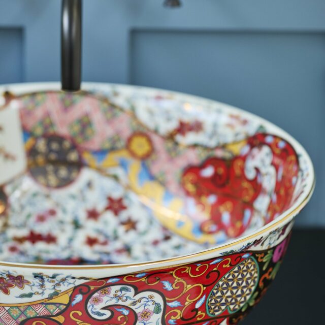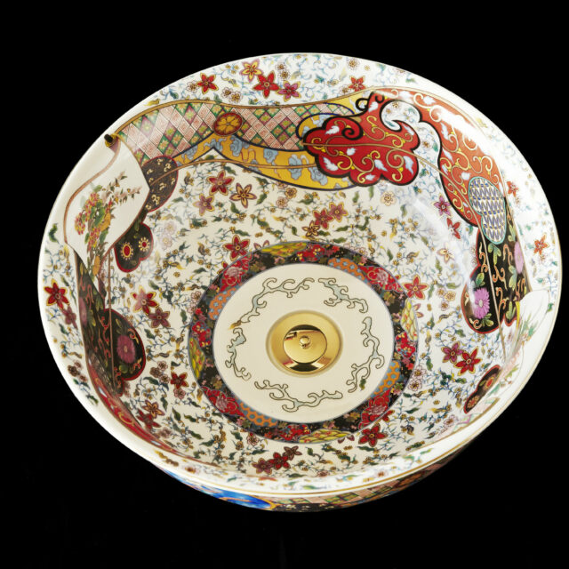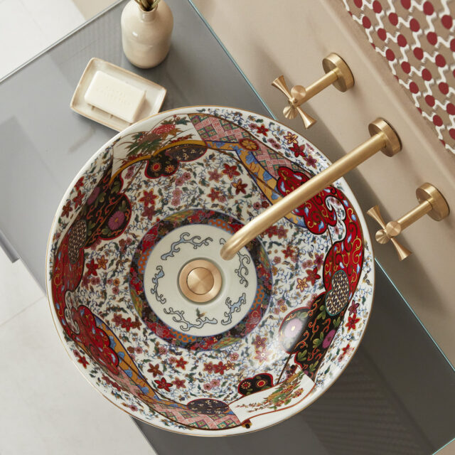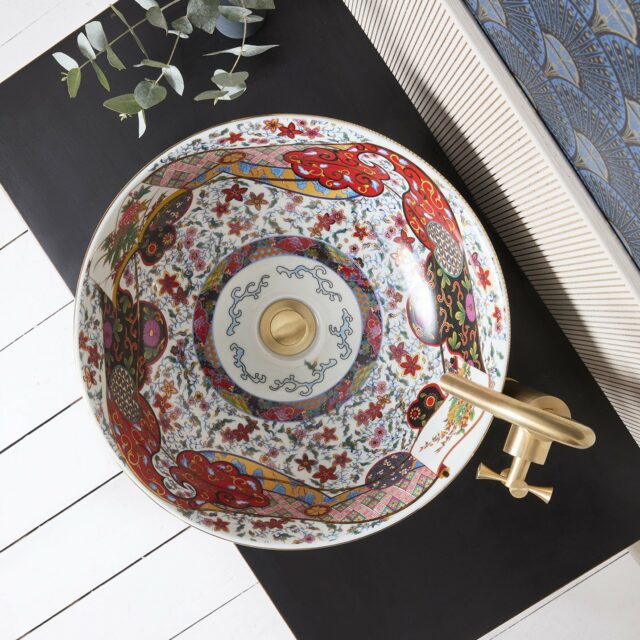 The Laila countertop basin blends traditional Oriental artistry with a modern boho-chic aesthetic, resulting in a truly captivating design. Meticulously hand-finished, its shallow form and gently curved lip are elevated by a bold, vibrant color palette accented with luxurious gold detailing. Inside, delicate illustrations of graceful crane birds and iconic Oriental fans add a distinctive touch of elegance. This basin is a statement piece that seamlessly marries classic motifs with contemporary style, making it an unforgettable choice for sophisticated interiors.