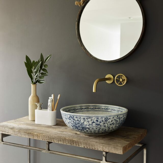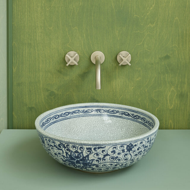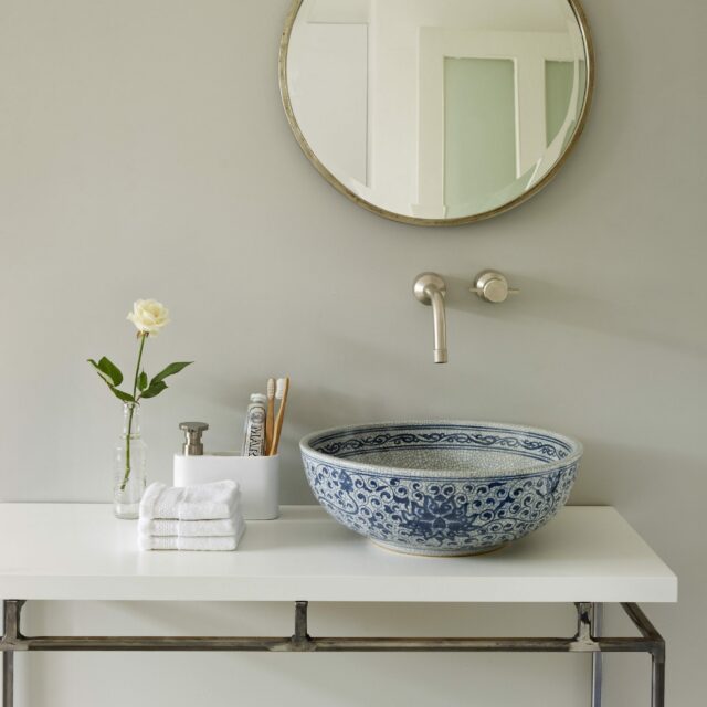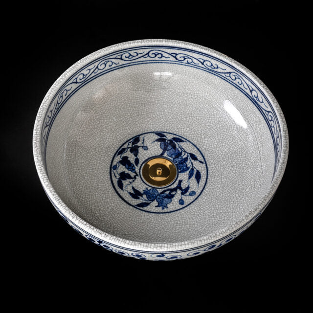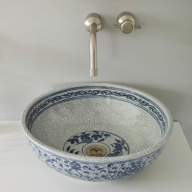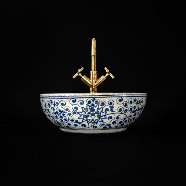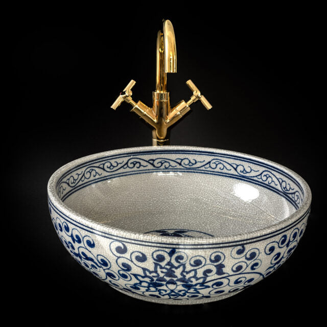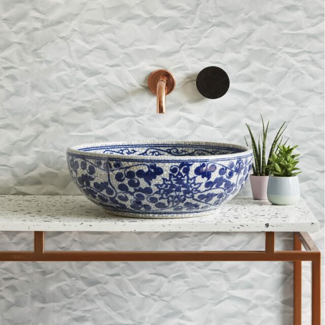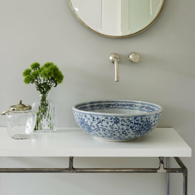 The Marielle basin offers a fresh take on the classic blue-and-white color combination, enhanced by its hand- crafted, distinctive crackle glaze. The swirling Oriental pattern adds a touch of elegance that seamlessly blends traditional artistry with contemporary design. Its timeless aesthetic makes it a versatile piece, effortlessly complementing both minimalist interiors and more vibrant, eclectic settings. Perfect for those seeking a statement basin with a refined, enduring charm.