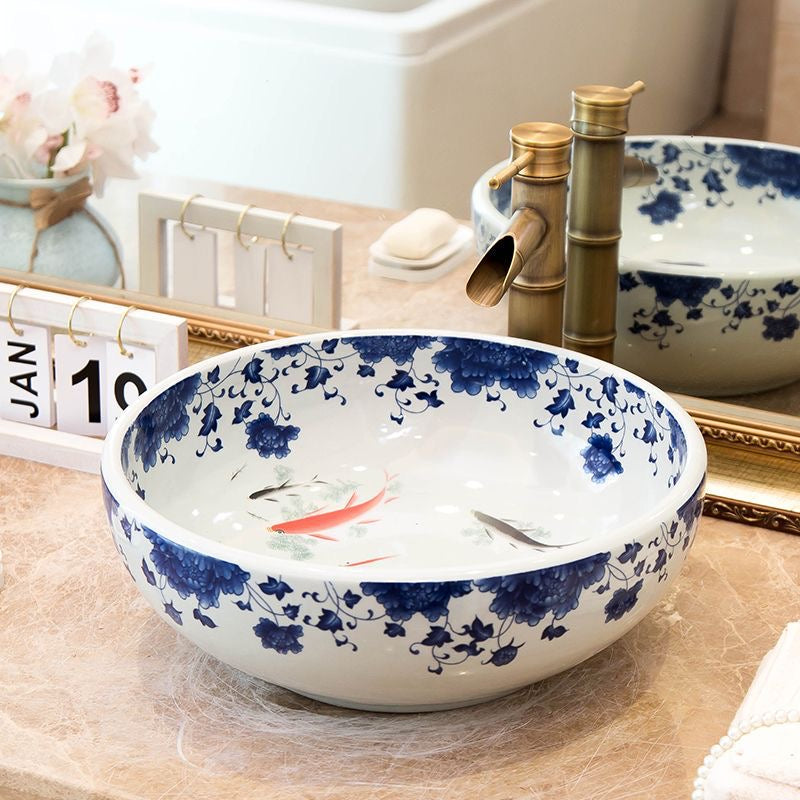 The Ruffled Isobel basin presents an elegant evolution of the classic Lorelei design, enhanced with a sophisticated scalloped edge. This refined detail beautifully complements the traditional blue-and-white pattern, inspired by Oriental porcelain. Inside, the distinctive fish and lotus blossom motifs symbolize wealth and abundance, infusing your bathroom with a touch of prosperity. The Scalloped Elara basin is also available in a version without the fish detail, offering a versatile option to suit various décor styles.